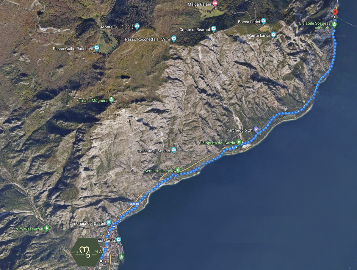 Der Radweg beginnt im historischen Zentrum von Limone sul Garda, schlängelt sich durch alte Zitronengärten und romantische Ausblicke bis zum Capo Reamol, wo der eindrucksvollste Abschnitt beginnt: Die Strecke schwebt über dem Wasser, ist am Felsen befestigt und bietet spektakuläre Ausblicke. Dieser letzte ausgesetzte Abschnitt erreicht die Grenze zwischen der Lombardei und dem Trentino. In den nächsten Jahren wird die Verbindung bis nach Riva del Garda fertiggestellt, aber schon heute bietet der Radweg den Touristen ein einzigartiges und unvergessliches Erlebnis.